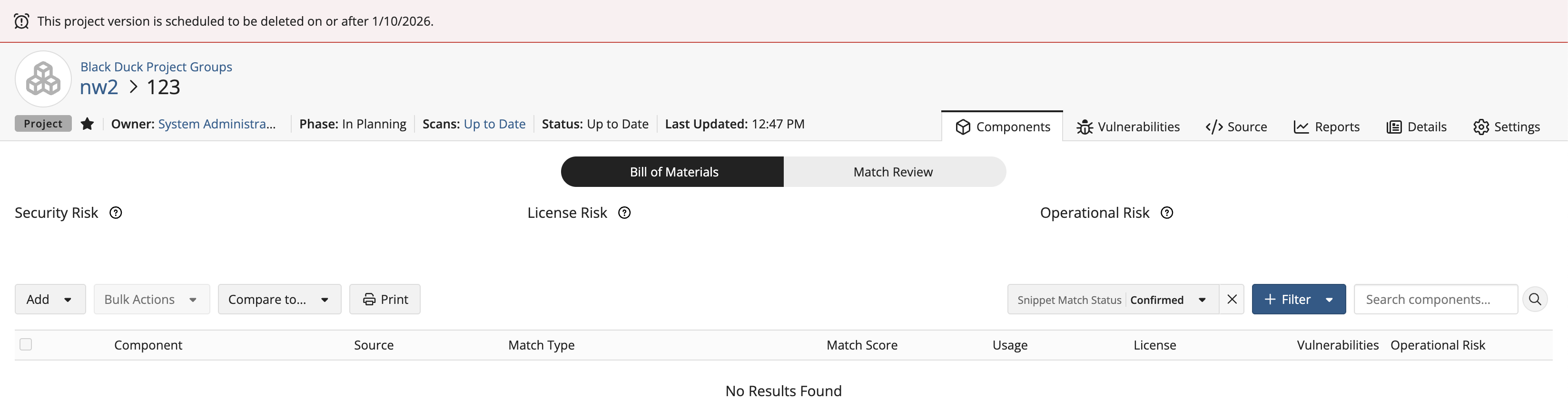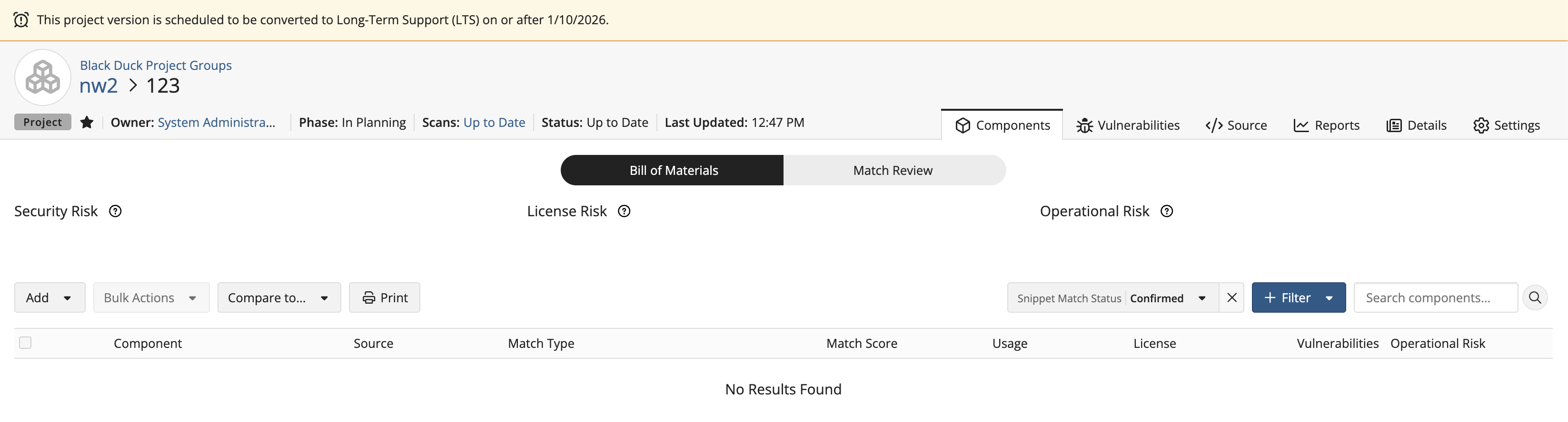 A banner will also be displayed on the top of the project version's BOM page.